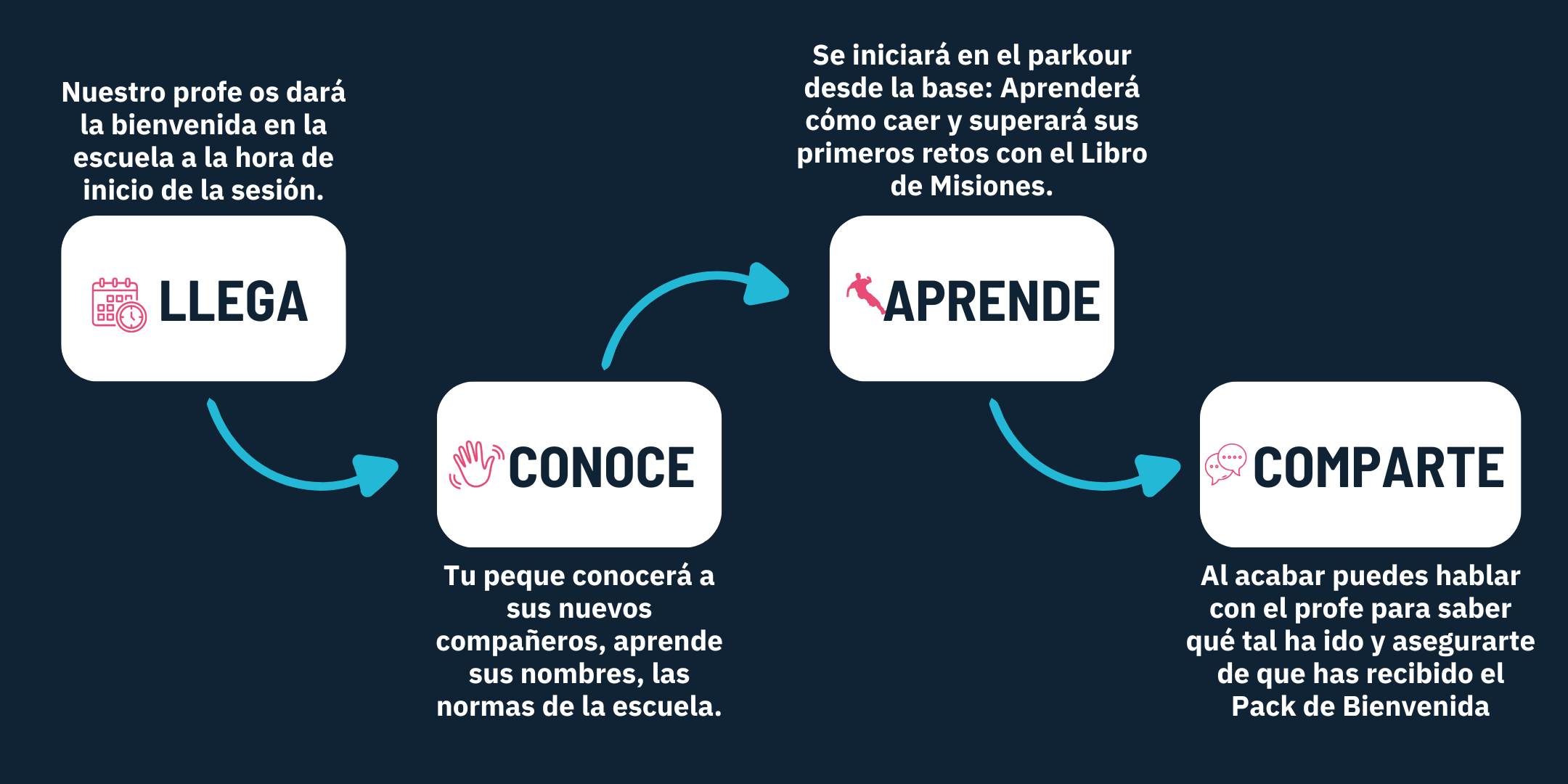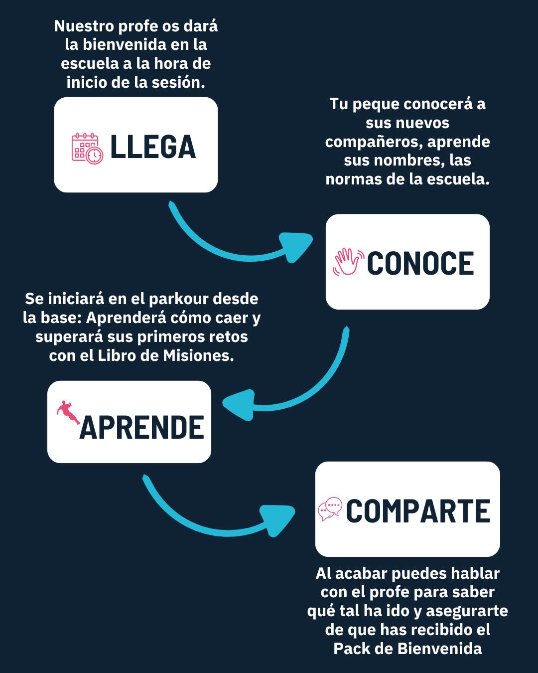 Cada clase es una experiencia de conexión, nuevas habilidades y diversión. De la mano de nuestros profes, tu peque aprende primero cómo caer y controlar y después a saltar. Gana confianza, coordinación y autocontrol en un entorno seguro.